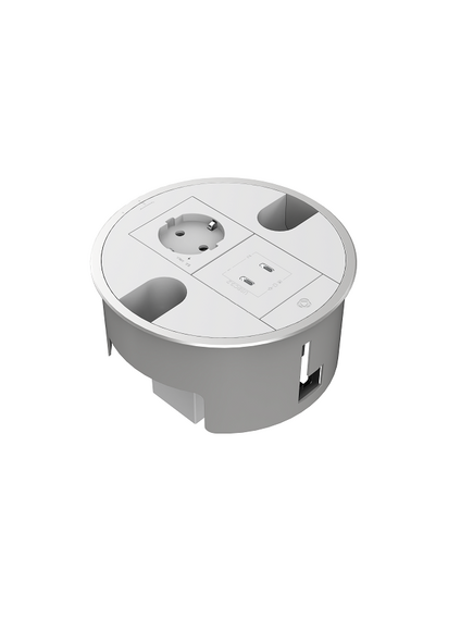 T-IN2-RND1 — Встраиваемый в поверхность мебели для конференц-залов (стола, кафедры, трибуны и т.д.) открытый круглый модуль (без крышки), предназначенный для кабельных подключений ноутбуков или иных персональных устройств участников. Модуль легко устанавливается с верхней стороны рабочей поверхности сквозь заранее подготовленное отверстие и фиксируется снизу посредством прижимных струбцин. При помощи рамки и двух модульных вставок с разъёмами формируется необходимая конфигурация. Вставки легко и быстро устанавливаются и фиксируются при помощи специального интегрированного запирающего устройства.