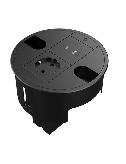 T-IN2-RND1 — Встраиваемый в поверхность мебели для конференц-залов (стола, кафедры, трибуны и т.д.) открытый круглый модуль (без крышки), предназначенный для кабельных подключений ноутбуков или иных персональных устройств участников. Модуль легко устанавливается с верхней стороны рабочей поверхности сквозь заранее подготовленное отверстие и фиксируется снизу посредством прижимных струбцин. При помощи рамки и двух модульных вставок с разъёмами формируется необходимая конфигурация. Вставки легко и быстро устанавливаются и фиксируются при помощи специального интегрированного запирающего устройства.