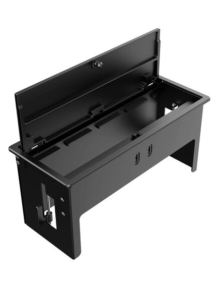 T-IN4-REC2 — Встраиваемый в поверхность мебели для конференц-залов (стола, кафедры, трибуны и т.д.) модуль с крышкой, предназначенный для кабельных подключений ноутбуков или иных персональных устройств участников. Модуль легко устанавливается с верхней стороны рабочей поверхности сквозь заранее подготовленное отверстие и фиксируется снизу посредством прижимных струбцин. При помощи рамки и двух модульных вставок с разъёмами формируется необходимая конфигурация. Вставки легко и быстро устанавливаются и фиксируются при помощи специального интегрированного запирающего устройства.